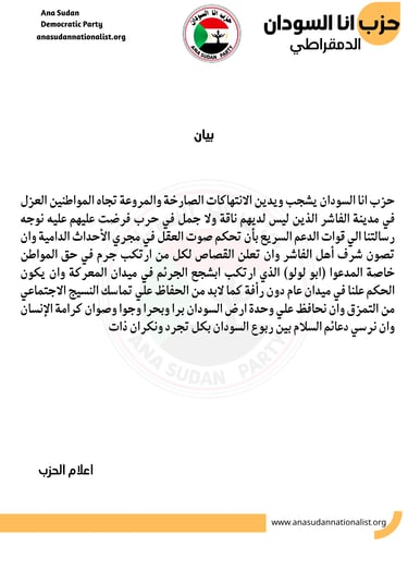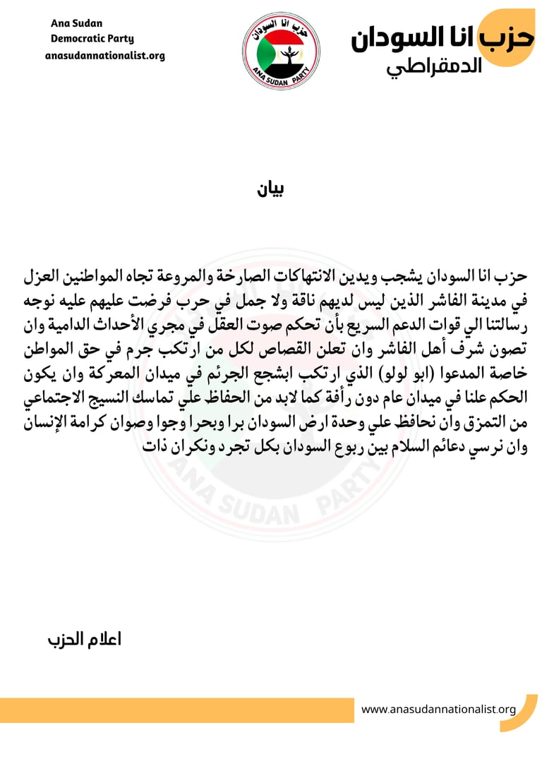 انا السودان حزب سياسي سوداني ، يسعي لإقامة الدولة الوطنية الديمقراطية الحديثة ، التي تقوم علي مبادئ الحرية وسيادة حكم القانون والمشاركة السياسية والعدالة بين المواطنيين /والمواطنات في الشأن السياسي والإلتزام بالشرعية الدولية لحقوق الانسان وترسيخ حقوق المواطنة المتساوية بين السودانيين/ات بصرف النظر عن الإنتماء الديني أو الطائفي أو الأثني أو الايدولوجي وغيره ، وتعزيز القيم والآليات لترسيخ الديمقراطية في الدولة وإثراء الثقافة الوطنية وإدارة التنوع وصون وحدة المجتمع وحماية الوطن والسير نحو طريق التنمية والرفاة الاجتماعي
